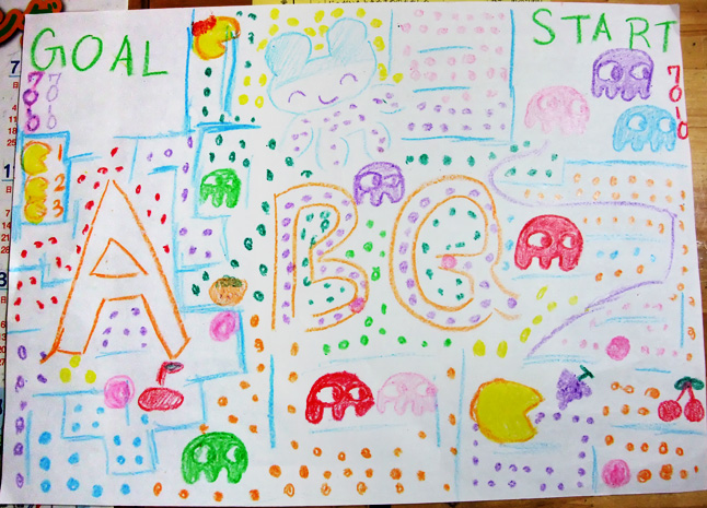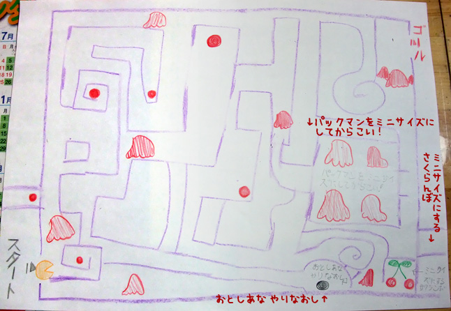 で、まぁうちの三姉妹の三女(4歳児)さんが、「迷路書く!(パックマンは迷路らしい)」ので、ちょっとボクが手伝いつつ書いたのが以下・・・